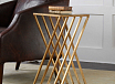 Трехмерный угловой акцентный стол с блестящей накладкой из сусального золота. Верхняя часть выполнена из прозрачного стекла, а основание имеет вставленное простое зеркало.